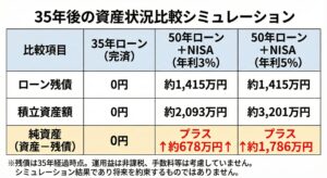 計算上は、50年ローンで長く借り、その期間中に運用がうまくいけば、増加した利息負担を補って余りある資産が築ける可能性があります。
