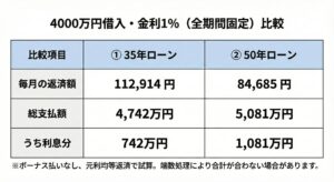 • 50年ローン: 毎月の負担は軽いが、支払う利息総額は多い。