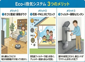 そこで私たちが注文住宅で標準採用しているのが、イシンホームの「Eco-i(エコアイ)換気システム」です。