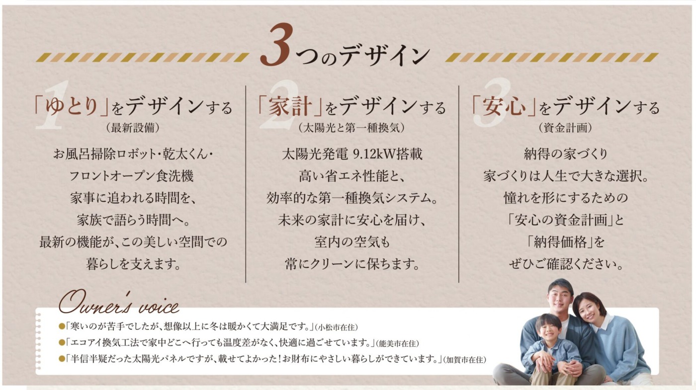 •「寒いのが苦手でしたが、想像以上に冬は暖かくて大満足です。」(小松市在住)