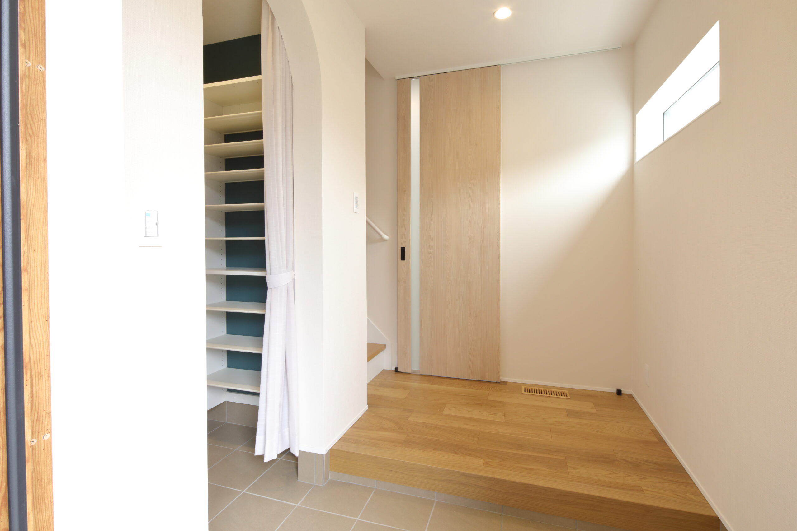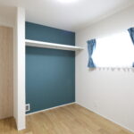 深みのあるモスグリーンのガルバリウム外壁に、木目の軒天がアクセントを添えるモダンな佇まい。 このお住まいの最大の特徴は、**「1階に主寝室を配置した間取り」**です 。 夫婦の生活スペースをすべて1階に集約することで、将来は階段の上り下りがない「平屋のような暮らし」が可能になります。